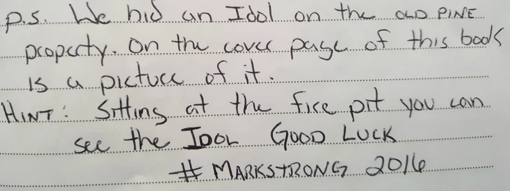 My husband read the clues and we learned everywhere the idol had been placed and found. With each entry, our intrigue grew until we got to the last entry and clue and it was our turn.